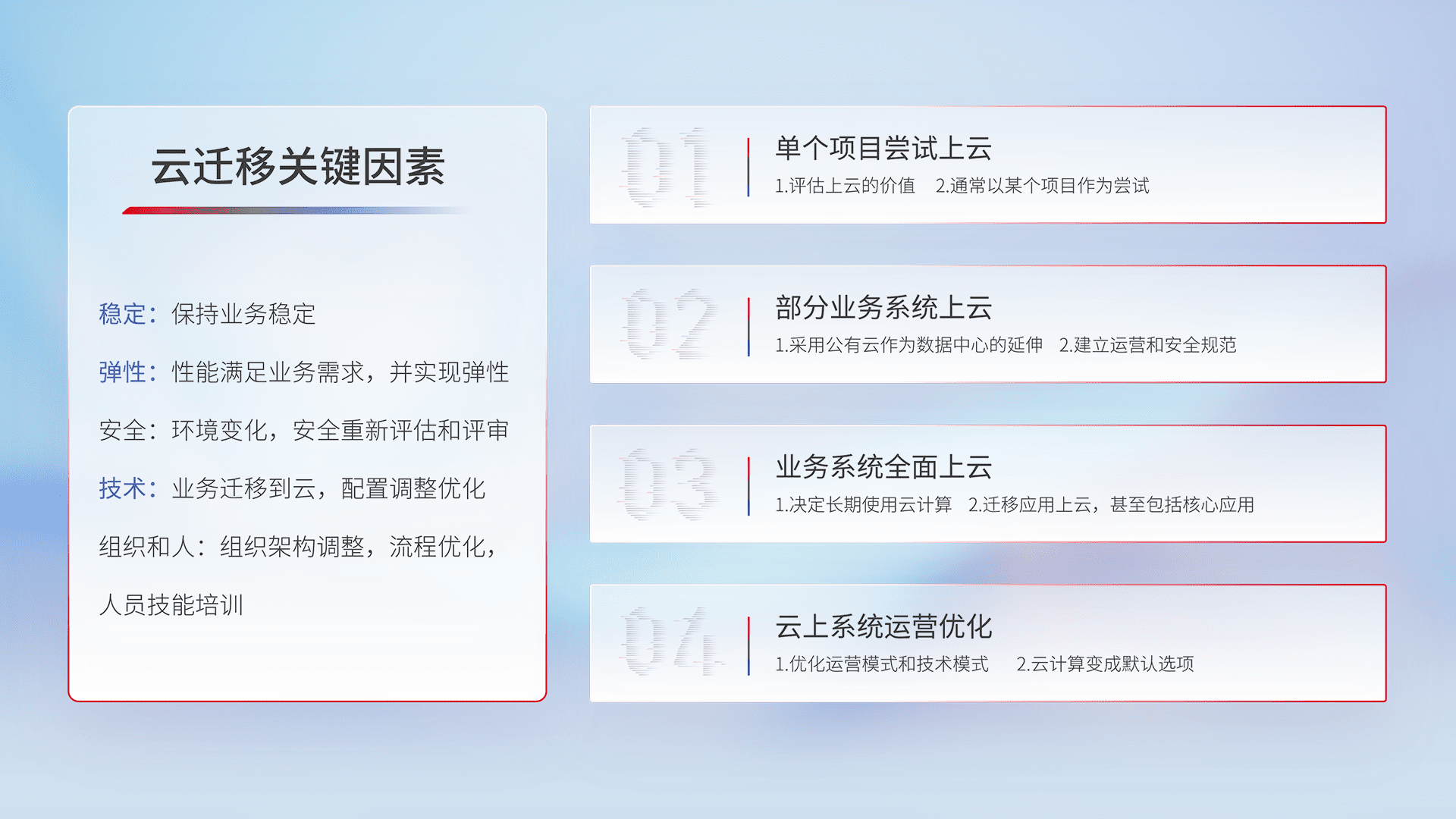 结合实际业务,,,从规划设计、、、、云平台选型、、云原生改造、、、、数据迁移、、、集成交付,,,,迁移全过程为客户识别最佳上云路径,,,做好风险识别管理,,,设计网络架构、、、、身份权限、、、、安全审计合规、、操作审计、、、、日志审计、、、、监控告警策略、、、、多站点容灾设计等,,对云上基础设施进行整体规划,,提升IT治理水平,,,,以满足弹性、、、高可用、、、高性能的需求。。。